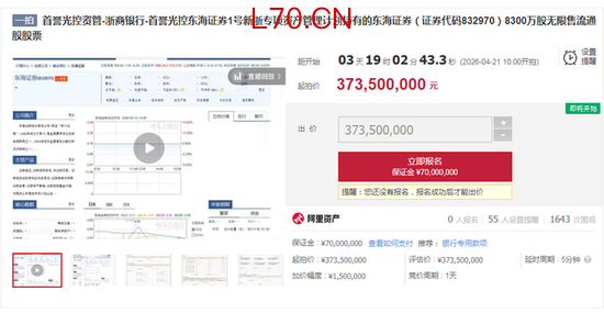 此次拍卖的股权,来自“首誉光控资管-浙商银行-首誉光控东海证券1号新三板专项资产管理计划”,对应东海证券4.4731%的股份,是公司第四大股东所持全部无限售流通股。根据拍卖规则,本次起拍价与评估价持平,需缴纳7000万元保证金,竞价增价幅度为150万元/次,竞价周期1天。截至4月17日,该标的已有超1600次围观、55人设置提醒,但尚未有报名竞拍者。
