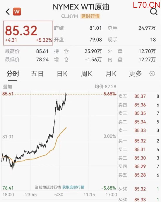 WTI原油向上突破85美元/桶关口,为2024年4月以来首次,日内一度大涨7.7%。