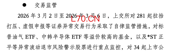 同日,上海证券交易所最新发布:2026年3月2日至2026年3月6日,上交所对281起拉抬打压、虚假申报等证券异常交易行为采取了自律监管措施,对标普油气ETF、中韩半导体ETF等溢价较高的基金,以及*ST正平(维权)等异常波动退市风险警示股票进行重点监控,对34起上市公司重大事项等进行专项核查,向证监会上报涉嫌违法违规案件线索6起。