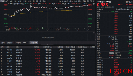 农牧渔板块今日(4月14日)继续猛攻,全市场首只农牧渔ETF(159275)开盘短暂下探后震荡拉升,盘中场内价格最高涨幅达到2.29%,截至收盘,涨2.18%。