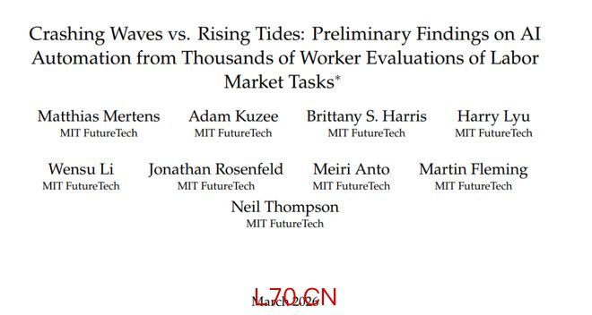 2026年3月,麻省理工学院FutureTech团队发布工作论文《巨浪还是潮汐:来自数千名工人对劳动力市场任务评估的AI自动化初步发现》(论文编号:arXiv:2604.01363v1),作者包括Matthias Mertens、Neil Thompson等人,研究资金来自Open Philanthropy及一家科技公司。