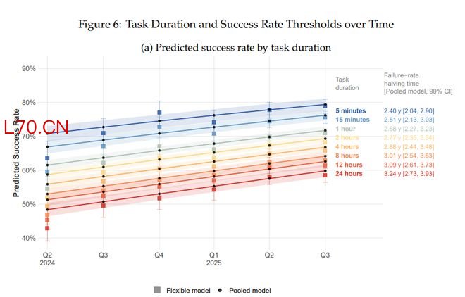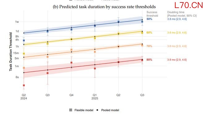 研究写道:“在2024年第二季度至2025年第三季度期间,前沿模型在3至4小时任务上的成功率从50%提升至1周任务,在1分钟任务上的成功率从70%提升至1小时任务。”